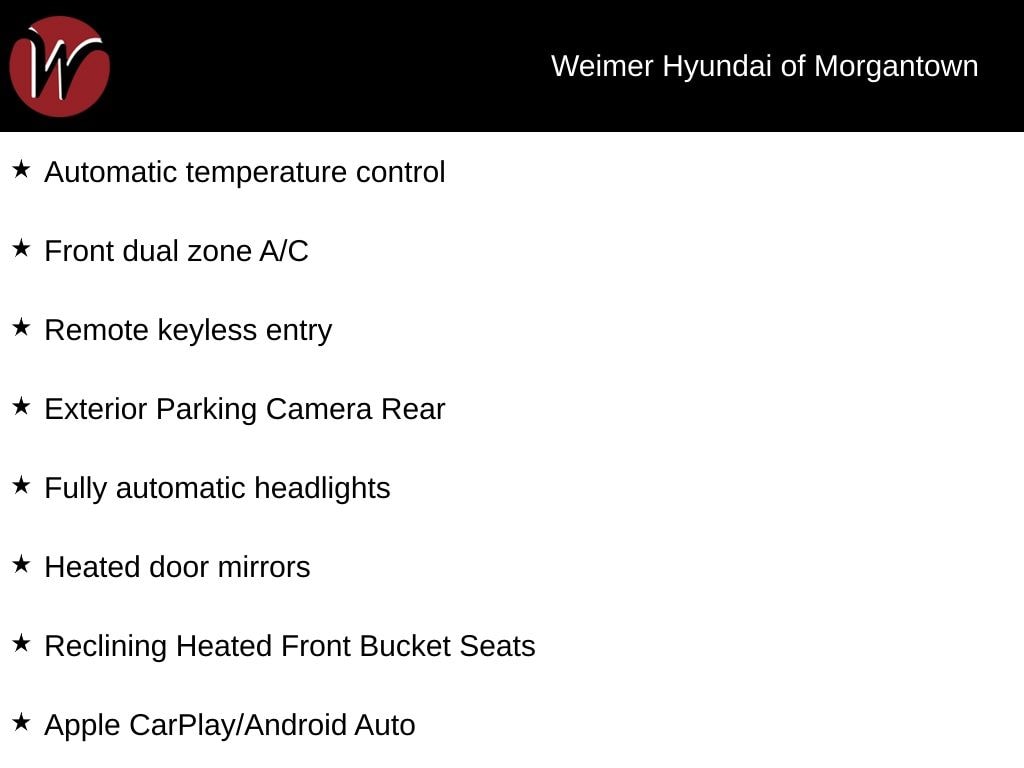 **Weimer Hyundai of Morgantown is your premier destination for both new and Used vehicle's and is proud to be the only non-commission-based dealership in the area. At Weimer Hyundai, we are eager to buy your trade-in! Before you consider selling your vehicle to www.carmax.com or listing it on www.autotrader.com, Cars.com, or www.ebay.com, reach out to our Inventory Manager at (304.658.7800) for a fantastic offer. WE PROMISE TO GIVE YOU $500 MORE THAN ANY Kelly Blue Book Instant Cash OFFER!**