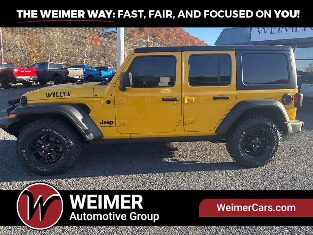 * CLEAN CARFAX *, Wrangler Unlimited Willys, 3.6L V6 24V VVT, 8-Speed Automatic, 4WD, Baja Yellow Clearcoat, 7.0" Touchscreen Display, Air Conditioning w/Auto Temperature Control, Air Filtering, Anti-Spin Differential Rear Axle, Apple CarPlay, Cluster 7.0" TFT Color Display, Dual front impact airbags, Dual front side impact airbags, For More Info, Call 800-643-2112, Front anti-roll bar, Front Bucket Seats, Front LED Fog Lamps, Google Android Auto, GPS Antenna Input, Integrated Center Stack Radio, Integrated roll-over protection, LED Headlamp & Fog Lamp Group, LED Premium Reflector Headlamps, Low tire pressure warning, MOPAR All-Weather Floor Mats (DISC), Occupant sensing airbag, Outside temperature display, ParkView Rear Back-Up Camera, Power Heated Mirrors, Radio: Uconnect 3 w/5" Display, Radio: Uconnect 4 w/7" Display, Rear anti-roll bar, Remote Keyless Entry, SiriusXM Radio Service, SiriusXM Satellite Radio, Split folding rear seat, Steering wheel mounted audio controls, Stop-Start Dual Battery System, Technology Group, USB Host Flip, Willys, Willys Hood Decal.